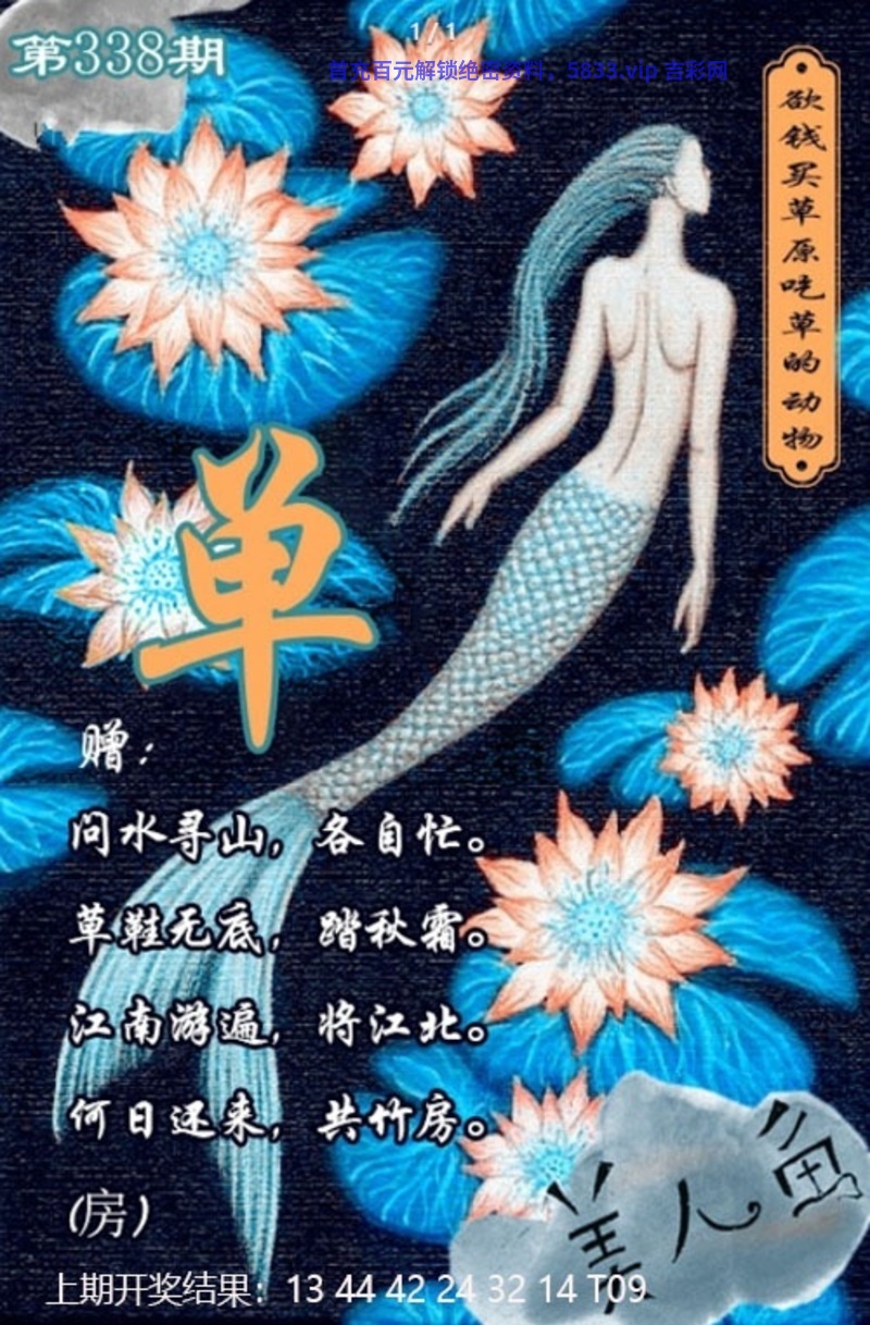 337期:美人鱼 解:上皇弓剑,香何追。日倚宫阙,自柱颐。宝册有儿,开大府。生离争级,在宫时 综合:鸡蛇牛兔鼠龙